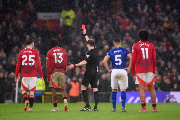 تقابل منچستریونایتد و ایپسویچ‌تاون با عملکرد فاجعه‌بار پاتریک دورگو همراه بود. هافبک جدید شیاطین سرخ با یک اشتباه و ناهماهنگی عجیب در دقیقه ۴ گل نخست را تقدیم شاگردان کایرن مک‌کنا کرد. یونایتد در دوره حضور روبن آموریم در ۱۲ مسابقه گل نخست را از رقبا دریافت کرده که از هر تیم لیگ برتری دیگر بیش‌تر است. یونایتد با گل به خودی سم مرسی مصری به بازی برگشت و با شلیک دلیخت به سقف دروازه حریف، پیش افتاد اما پاتریک دورگو در فاصله ۲ دقیقه مانده به پایان مسابقه به دلیل تکل خشن روی هاچینسون از زمین مسابقه بیرون رفت.