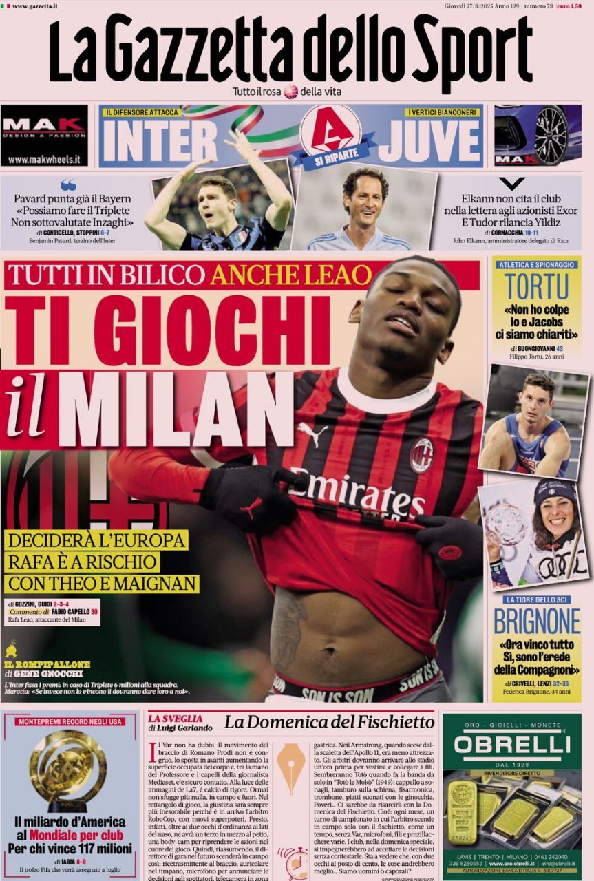 گاتزتا دلوسپرت مصاحبه بنژامن پاوار را برجسته کرده که وعده فتح سهگانه به هواداران داده و گفته است: «هرگز اینزاگی را دستکم نگیرید!» این نشریه همچنین اشاره داشته کسب سهمیه لیگ قهرمانان اروپا و عبور از سد اینتر در جام حذفی، تنها راه بقای کونسیسائو روی نیمکت میلان است.