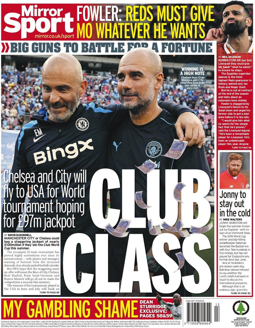 در میان جراید انگلیسی، میرر ضمن انتشار تصویر سرمربیان حاضر از لیگ برتر انگلیس در جامجهانی باشگاهها، مبلغ تعیین شده برای قهرمان این مسابقات را 97 میلیون پوند خبر رسانده و از قصد تیمهای چلسی و منچسترسیتی برای قهرمانی در این رقابتها پرده برداشته است.