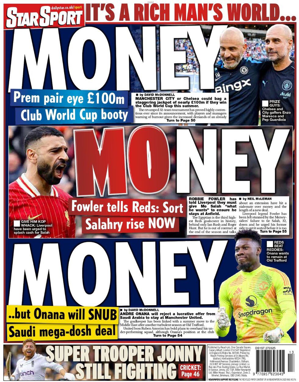 استار اسپورت، تمایل اونانا برای پاسخ منفی دادن به پیشنهاد هنگفت عربستان سعودی به قصد بقا در منچستریونایتد را برجسته کرده و در دیگر بخشها، «مصاحبه رابی فاولر در وصف شرایط صلاح» و «پاداش هنگفت مشخص شده برای قهرمانی در جامجهانی باشگاهها» را بازتاب داده است.