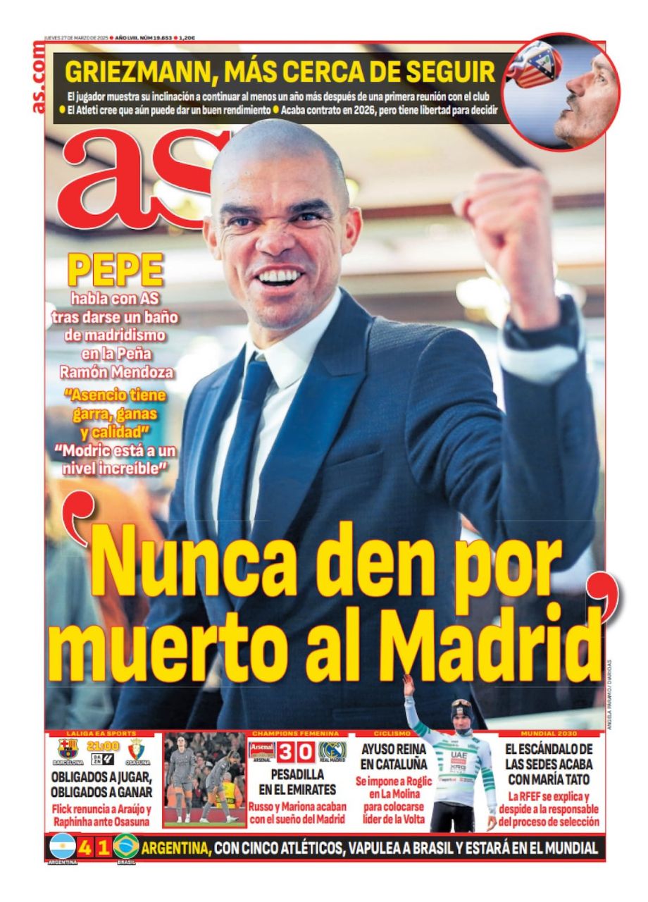 در اسپانیا، آ س مصاحبه پپه، مدافع اسبق رئال مادرید را بازتاب داده که در صحبتهای مدافع پرتغالی به میزبانی گردهمایی هواداران مادرید در کانون هواداری رامون مندوسا، جملههای «آسنسیو یک بازیکن کلیدی با هیجان و انگیزهای بالا در میدان است!»، «مودریچ هنوز در سطحی باورنکردنی کیفیت خود را به نمایش میگذارد!» و «هرگز رئال مادرید را مستاصل نپندارید!» کلیدی هستند.