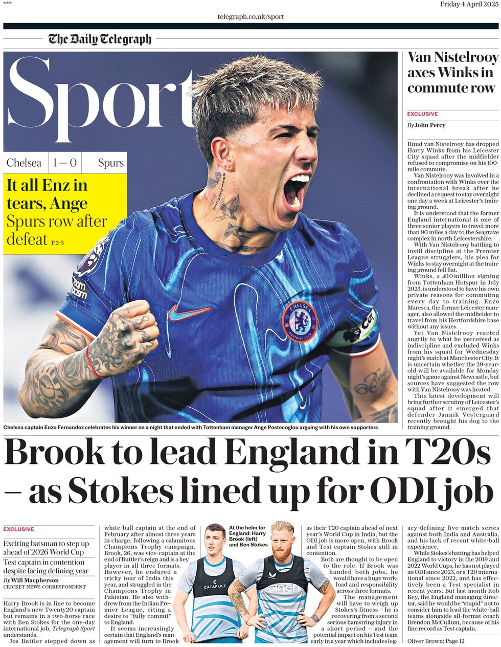 جراید انگلیسی پیروزی چلسی مقابل تاتنهام و مشخص شدن میزان دقیق مصدومیت گابریل در اردوگاه آرسنال را برجسته کردهاند. دیلی تلگراف با طعنه به گلزنی انزو فرناندس، اشاره داشته آنژ پوستکوگلو روز به روز به اخراج از سکان هدایت تاتنهام نزدیکتر میشود و «خداحافظی با ناکامی و حسرت، سرنوشت سرمربیان تاتنهام است!»