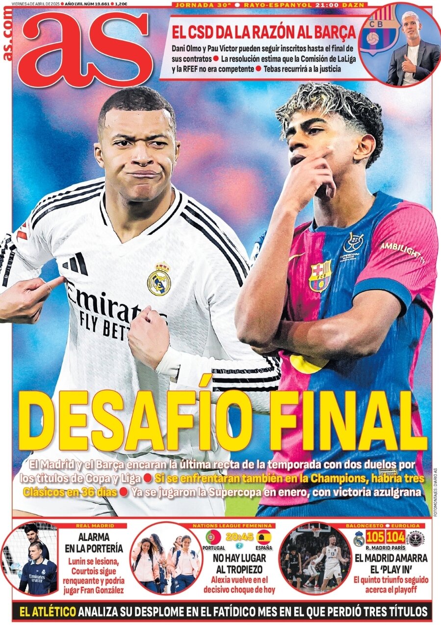 آ س، دیگر جریده چاپ مادرید ضمن انتشار تصویر لامین یامال و کیلیان امباپه، تیتر «چالش پایانی» را انتخاب کرده و نوشته است: «رئال مادرید و بارسلونا در واپسین مقطع فصل، 2 نبرد حساس برای فتح 2 جام متفاوت مقابل یکدیگر برگزار خواهند کرد. یکی در لالیگا و دیگری به میزبانی فینال جام حذفی! در صورتی که 2 تیم به فینال لیگ قهرمانان اروپا نیز برسند، به مدت 36 روز 3 الکلاسیکو برگزار خواهد شد و هر دو تیم شانس فتح سهگانه خواهند داشت!»