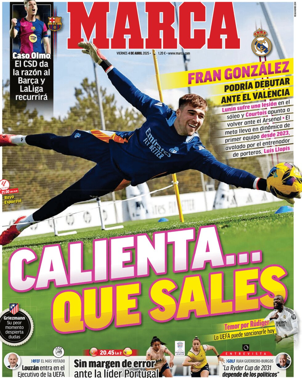 مارکا بحران روی خط دروازه رئال مادرید با مصدومیت جزئی لونین را برجسته کرده است. این نشریه نوشته: «آماده باش! کارلتو تو را به میدان خواهد فرستاد!» و اشاره داشته فران گونزالس، سنگربان جوان ممکن است در مصاف با والنسیا برای اولین بار در دوران حرفهای در دیداری رسمی با پیراهن رئال مادرید به میدان برود.