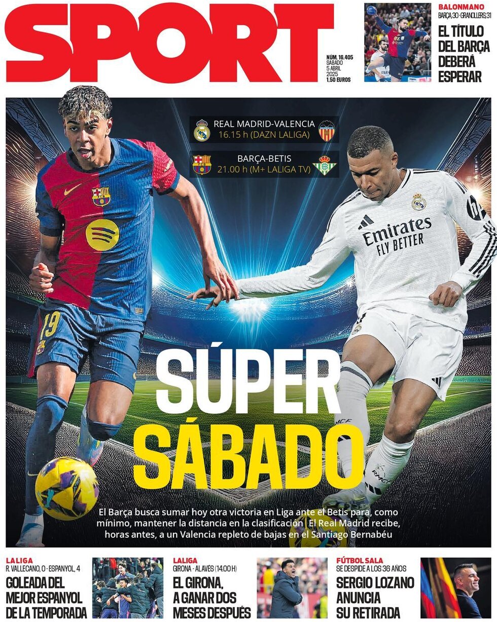 اسپورت بارسلون با انتخاب تیتر «شنبه هیجانانگیز» به استقبال رقابتهای حساس هفته سیام لالیگا رفته است که ابتدا رئال مادرید از والنسیا میزبانی میکند و سپس بارسلونا ماموریتی دشوار در خانه مقابل بتیس دارد. رئال مادرید و بارسلونا بهدنبال فاصله گرفتن از اتلتیکو مادرید، مدعیان اصلی فتح اسکودتو خواهند بود و فاصلهشان در کورس صدرنشینی با یکدیگر به بیش از 3 امتیاز نمیرسد.