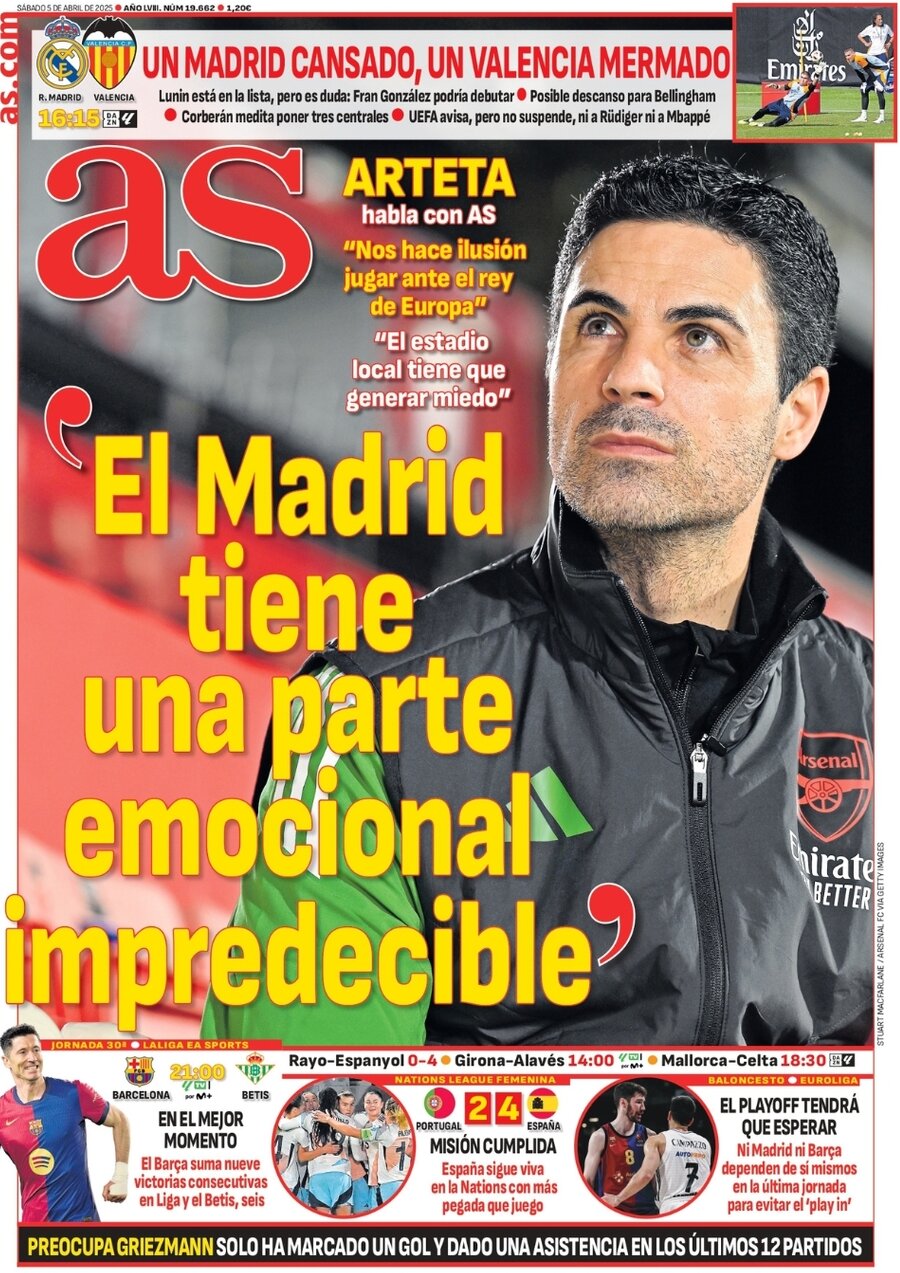 تیتر انتخابی مارکا در این باره، «بَم بَم امباپه» بوده و آ س، دیگر جریده چاپ مادرید مصاحبهای با میکل آرتتا، سرمربی اسپانیایی آرسنال ترتیب داده است. آرسنال رقیب رئال مادرید در مرحله یکچهارم نهایی لیگ قهرمانان اروپا خواهد بود و سرمربی این تیم گفته است: «رئال مادرید یک جنبه احساسی غیر قابل پیشبینی دارد و بازی مقابل «پادشاه اروپا» برای تیم ما هیجانانگیز است!»