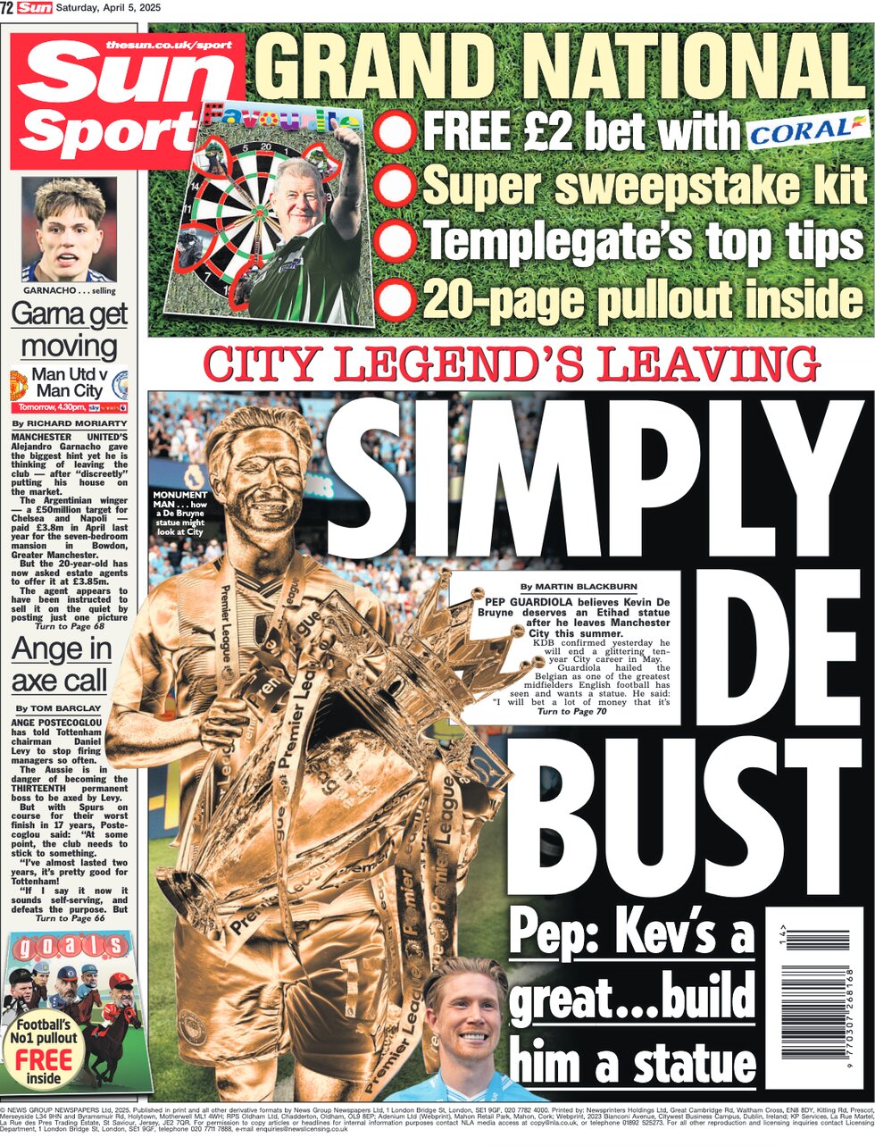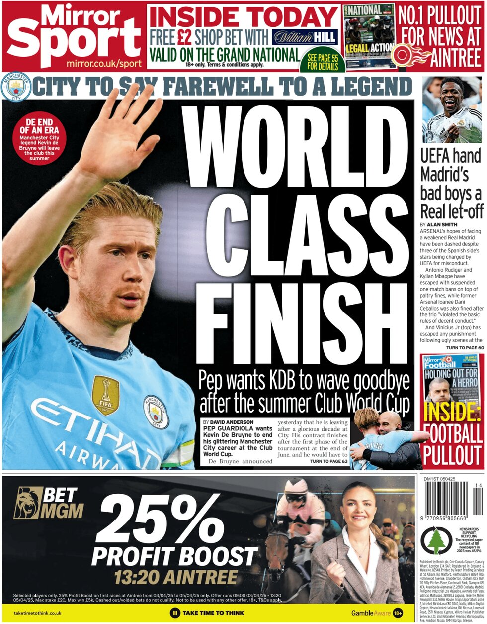 تمرکز جراید انگلیسی صبح شنبه بر خداحافظی کوین دیبروینه بوده است. میرر نوشته است: «منچسترسیتی باید با یک افسانه بدرود بگوید!» و سان با واکنش به مصاحبه پپ در این باره، سر تیتر اخبار را انتخاب کرده است. سرمربی اسپانیایی گفته است: «دیبروینه یکی از بهترینهای تاریخ است، باشگاه باید در تمجید از او مجسمهاش را بسازد!»