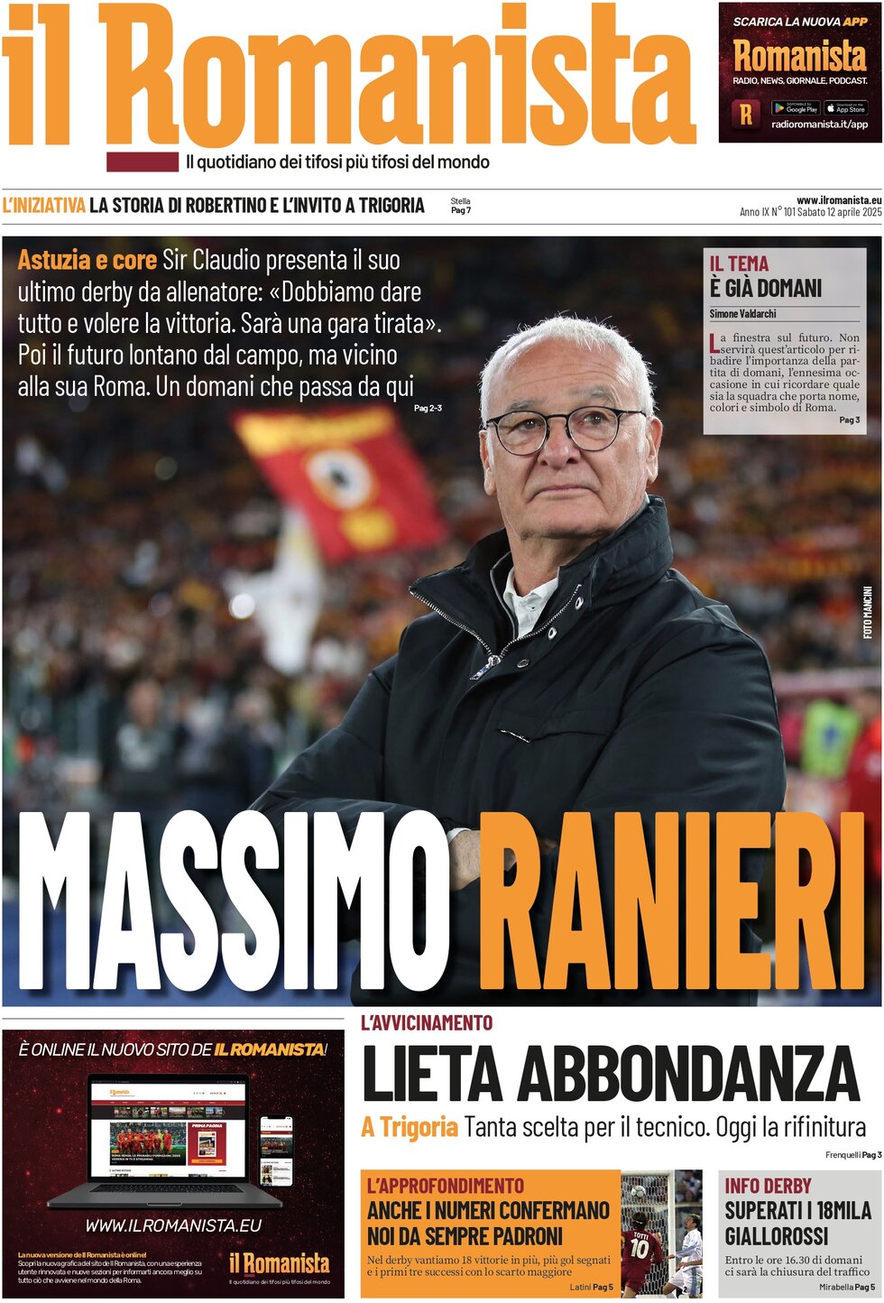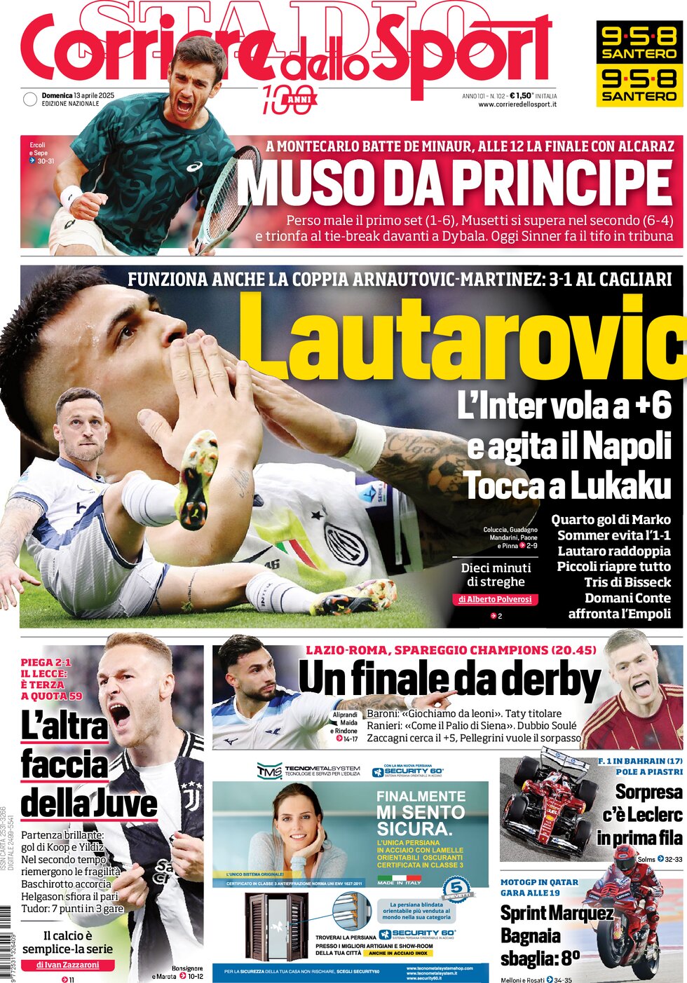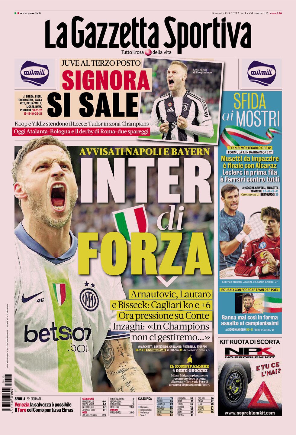 این نشریه همچنین پیروزی اینتر بر کالیاری را «هشدار اینزاگی و پسرانش به ناپولی در کورس فتح اسکودتو و بایرنمونیخ در لیگ قهرمانان اروپا» عنوان داده است اما در بخش دیگر، کورس بقا در سری آ را بررسیده که ونتسیا بهدنبال کسب پیروزی مقابل مونتسا، به بقا امیدوارتر شده است.