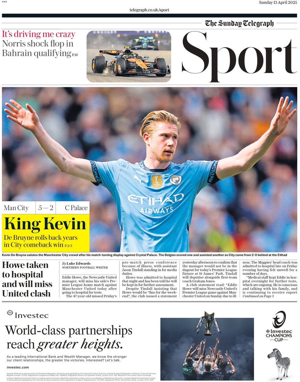 دیلی تلگراف نوشته است: «پادشاه کوین هنوز در قلعه به حکومت ادامه میدهد!» این نشریه همچنین به بیماری ادی هاو اشاره داشته که روانه بیمارستان شده و در مصاف با منچستریونایتد قادر به همراهی تیمش نخواهد بود. دستیاران ادی هاو وظیفه ایستادن کنار زمین در نبرد با شیاطین سرخ را بر عهده خواهند داشت.