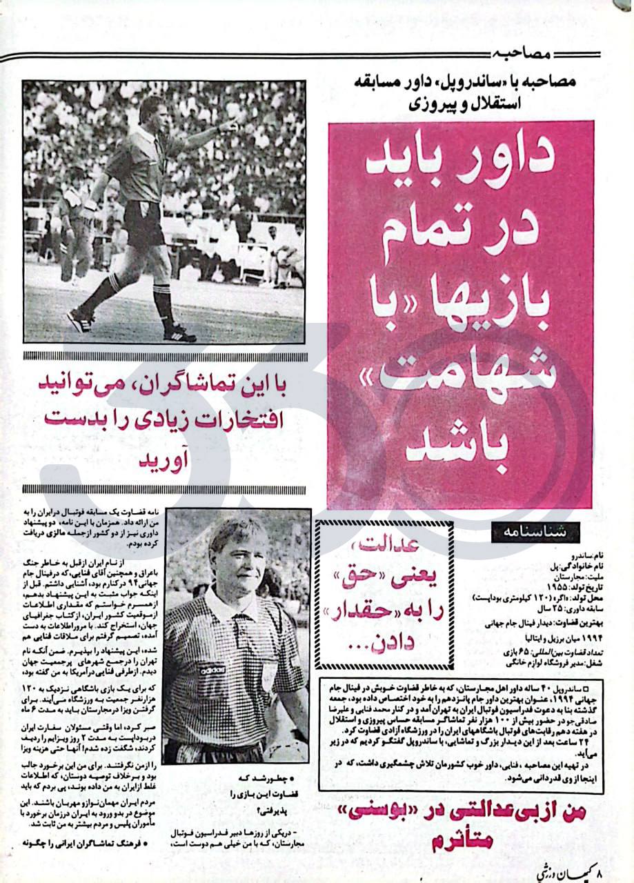 ساندرو پل داور مشهور آن سال‌ها اهل مجارستان بود در روستای کوچکی در نزدیکی بوداپست زندگی می‌کرد؛ او که مدیر یک فروشگاه لوازم خانگی بود، در عرصه بین‌المللی شهرت داشت اما معروفیت وی بیشتر به خاطر قضاوت در دیدار خاطره‌انگیز ایتالیا و برزیل در فینال جام جهانی 1994 بود. علاوه بر پیشنهاد قضاوت در داربی تهران، دو پیشنهاد دیگر هم از طریق رئیس فدراسیون مجارستان به دست وی می‌رسد، اما این داور پس از کمی تحقیق، پیشنهاد ایران را قبول می‌کند.