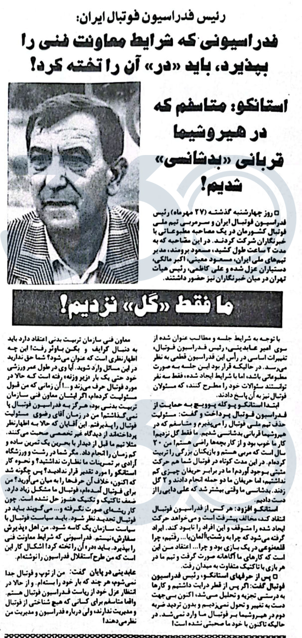 اول اردیبهشت روز شروع کار امیر عابدینی به عنوان رئیس فدراسیون فوتبال بود. او که با حکم مصطفی هاشمیطبا به این سمت منصوب شده بود، دوران ریاستش در فدراسیون فوتبال بسیار کوتاهتر از چیزی بود که تصورش را میکرد. اولین و مهمترین مأموریت عابدینی، انتخاب سرمربی تیم ملی و احیا آن به حضور در بازیهای آسیایی 1994 هیروشیما بود. عابدینی اولین مربی خارجی پس از انقلاب را برای تیم ملی انتخاب کرد. رفتار فدراسیون فوتبال و تا اندازهای سازمان تربیت بدنی به گونهای بود که کاملاً در خدمت استانکو پوکلهپوویچ بودند و همهجوره از تصمیمات و رفتارهای او حمایت میکردند. همین مسئله هم باعث شد تا مربیان ایرانی در مقابل استانکو موضع بگیرند.