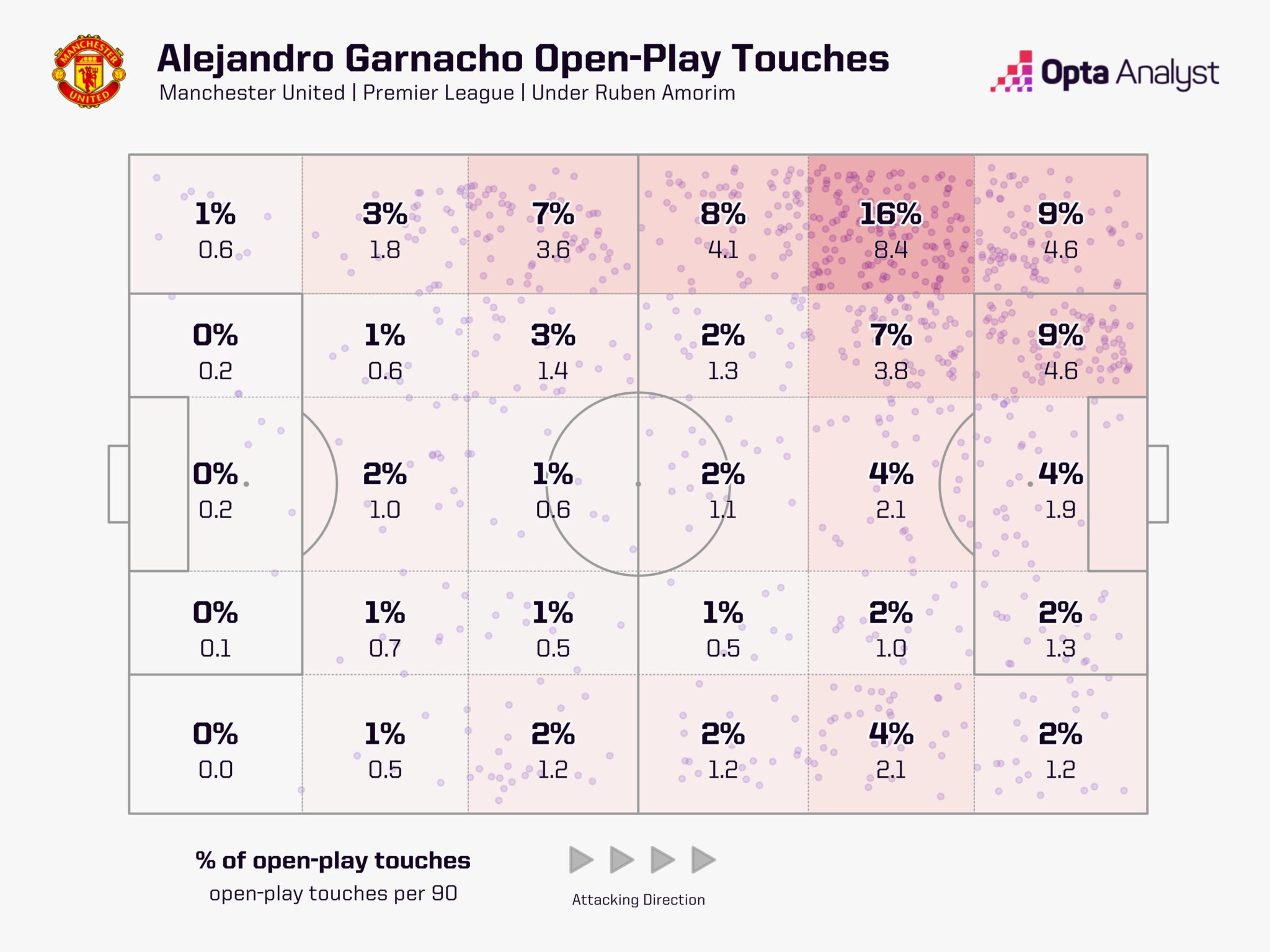 گارناچو همچنین ترجیح به شوتزنی بیشتر داشت. در میان بازیکنانی با 900 دقیقه بازی در لیگ برتر، او هشتمین بازیکن برتر از نظر شوتزنی و خلق موقعیت در جریان بازی بهازای هر 90 دقیقه بود (4.9) اما در این میان، 69.9 درصد تصمیمات گارناچو به شوتزنی ختم میشد.