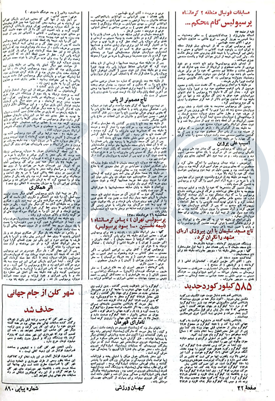 در روز سهشنبه 26 مرداد 1350، پرسپولیس به مصاف پاس کرمانشاه رفت و در یک بازی برتر موفق شد این تیم را با نتیجه 4 بر یک مغلوب کند. چهره برجسته این دیدار کسی نبود جز صفر ایرانپاک که هر 4 گل تیمش را بهثمر رساند. ایرانپاک در بازی اول پرسپولیس هم هتتریک کرد. پرسپولیس در این دیدار از چهرههایی همچون جعفر کاشانی، ابراهیم آشتیانی، علی پروین، محمود خوردبین، صفر ایرانپاک، داریوش مصطفوی و همایون بهزادی در ترکیب خود بهره میبرد. در حالیکه بازی با یک گل به سود سرخپوشان در جریان بود، در پی اتفاقاتی این بازی به حاشیه کشیده میشود.