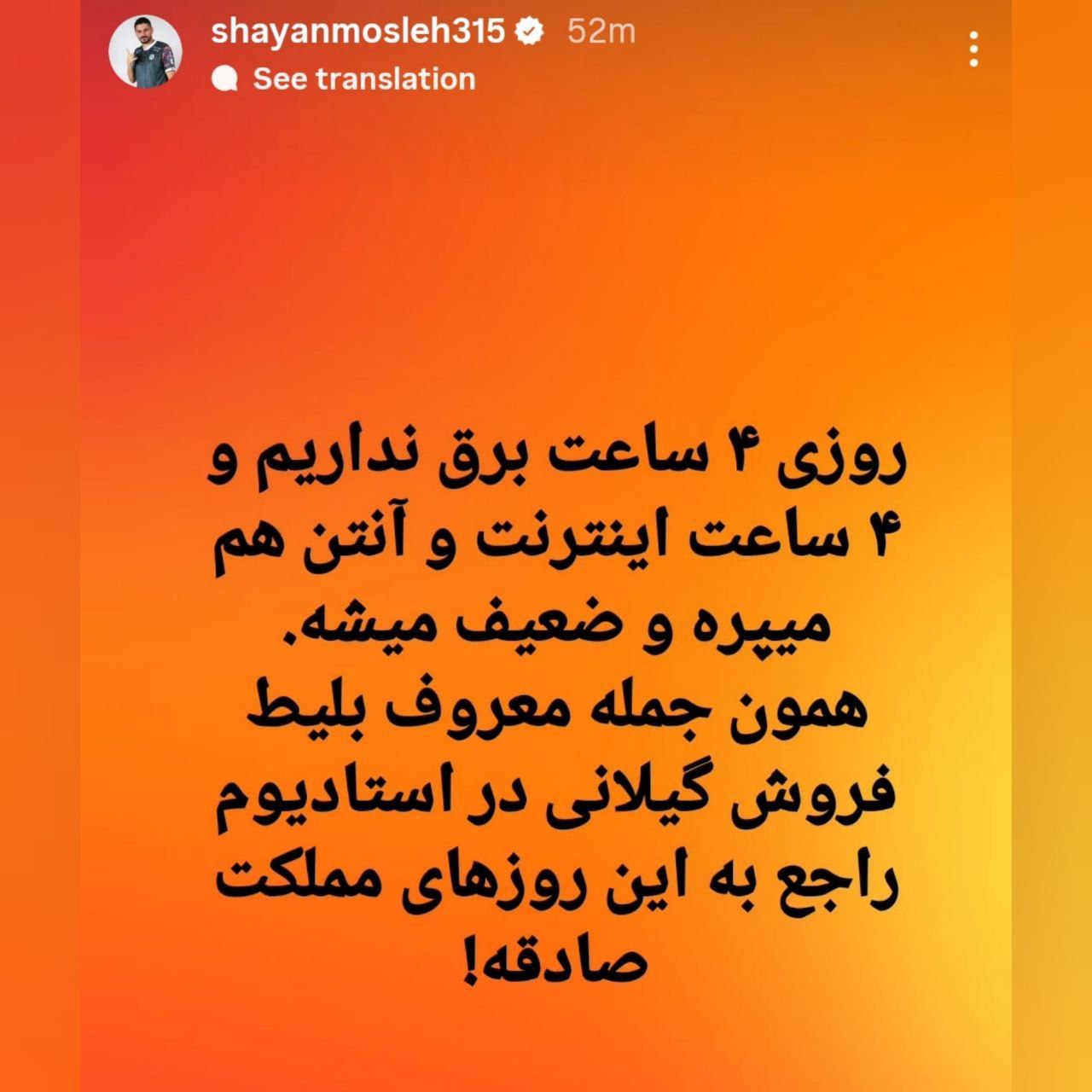شایان مصلح چهره متفاوتی در فوتبال ایران است؛ او چندین بار تا به الان به دلیل عقایدی که دارد اسیر محدودیت شده؛ ولی اینکه یکباره بابت یک استوری، محرومیت 20 روزهای شامل حالش شود، از آن دست غافلگیریها است که بسیاری را شوکه میکند. به ویژه خودش که بعد از بازی با استقلال مجبور شد، نسبت به آن واکنش نشان دهد. «به دلیل اعتراض به قطع برق و استوری که گذاشتم، این بازی محروم بودم. از ۲۸ مرداد نامه زده بودند اما چون تعطیل بود ابلاغ نشد که ۲۰ روز محروم هستم. من در استوریام نوشتم که چرا گاهی برق به مدت دو ساعت قطع میشود و چرا بعضی وقتها این قطع برق تا چهار ساعت ادامه دارد. به عنوان کاپیتان تیم ذوبآهن، نباید ناگهان من را محروم میکردند».
