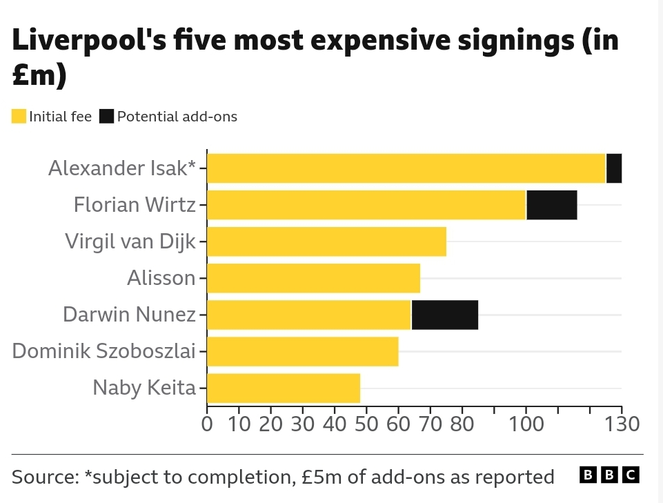 ورود ایساک این هزینه را افزایش خواهد داد. پس از جذب گوئهی، هوگو اکیتیکه، میلوش کرکژ، جرمی فریمپونگ، گیورگی مامارداشویلی و جیووانی لئونی، این قرارداد مجموع هزینههای باشگاه را بدون احتساب پاداشها به حدود ۴۵۱.۲ میلیون پوند میرساند که بالاترین مجموع هزینه یک پنجره خاص در تاریخ لیگ برتر انگلیس و تاریخ فوتبال جهان به شمار میرود.