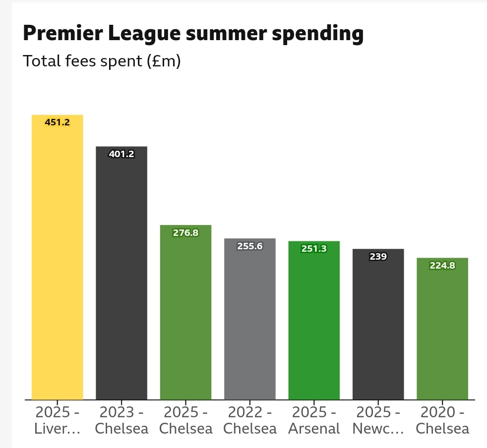 طبق آمار منتشرشده توسط BBC، تنها برای دومین بار یک تیم انگلیسی در یک تابستان بیش از ۴۰۰ میلیون پوند خرج میکند؛ پس از چلسی در تابستان سال ۲۰۲۳ با ۴۰۱.۲ میلیون پوند هزینه.