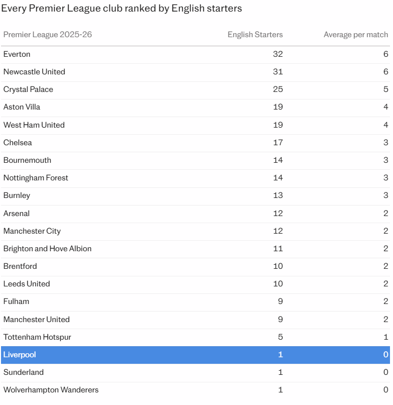 البته وقتی به کل لیگ برتر نگاه میکنیم، نمیتوانیم تنها قرمزها را مقصر بدانیم،پ زیرا فرهنگ استفاده از بازیکنان انگلیسی ظاهرا کمتر شده و تیمها، کمتر بازیکنان انگلیسی انتخاب میکنند. وقتی به آمار نگاه میکنیم، انتخاب بازیکنان انگلیسی به ازای هر تیم برای هر کدام از بازیها تنها 2.7 بازیکن بوده. باید قدردان اورتون و نیوکاسل باشیم زیرا در کنار یکدیگر کمک شایانی برای رسیدن به عدد 2.7 بازیکن انگلیسی برای هر دیدار داشتند. تافیها برخلاف همشهری خود با انتخاب 32 بازیکن از حداکثر 55 انتخاب ممکن در صدر قرار دارند و نیوکاسل با یک بازیکن کمتر در رده بعدی ایستاده.