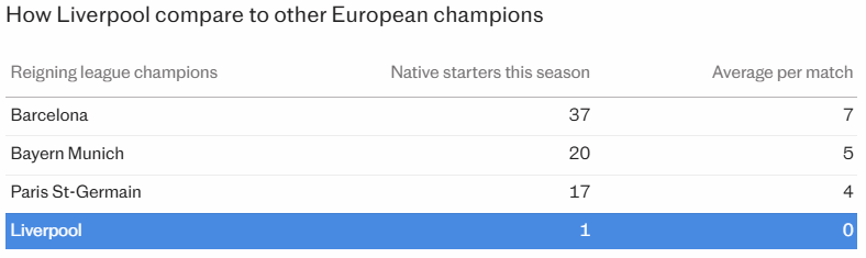 شاید این نگاه کمی نژادپرستانه باشد که قهرمان انگلیس از بازیکن انگلیسی استفاده نمیکند اما وقتی به قهرمانهای سایر نقاط جهان نگاه میکنیم میبینیم تیمهای ملی آنها منبع بزرگی از بازیکنان بومی دارند. در آلمان، بایرن مونیخ میانگین 5 آلمانی در ترکیب آغازین را داشت، پاریسنژرمن میانگین 4.3 بازیکن فرانسوی و بارسلونا میانگین 7.4 اسپانیایی را داشت و لازم است یک بار دیگر یادآوری شود اکنون 16 قهرمانی اروپا را دارا هستند و انگلیس توانایی رقابت با آنها را ندارد.