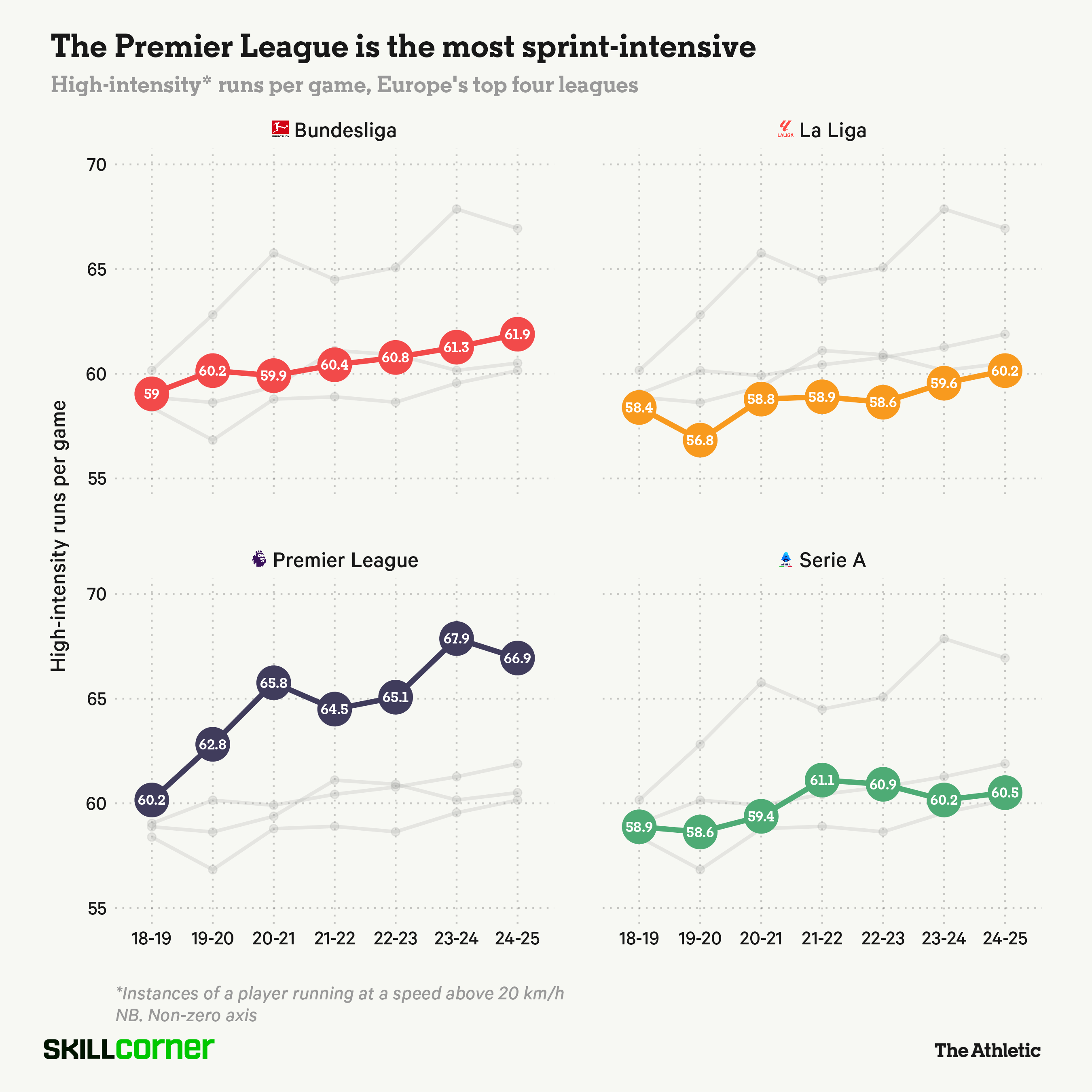سازگار شدن با شدت و سرعت لیگ برتر، دردسری است که تازهواردان اغلب به آن اشاره میکنند و آمارها هم همین موضوع را بیان میکنند. دادههای اسکیل کرنر نشان میدهد هر بازی، لیگ برتر انگلیس نسبت به اسپانیا، آلمان و سریآ، تعداد بیشتری دویدنهای با سرعت بالا (بالاتر از 20 کیلومتر در ساعت) دارد.