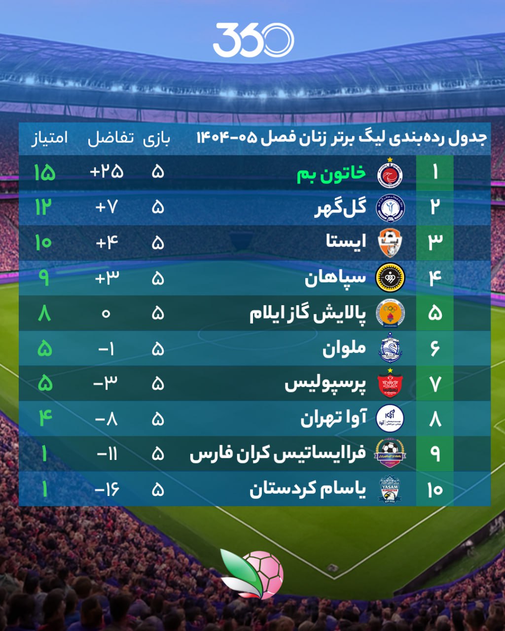جدول لیگ برتر زنان در پایان هفته پنجم