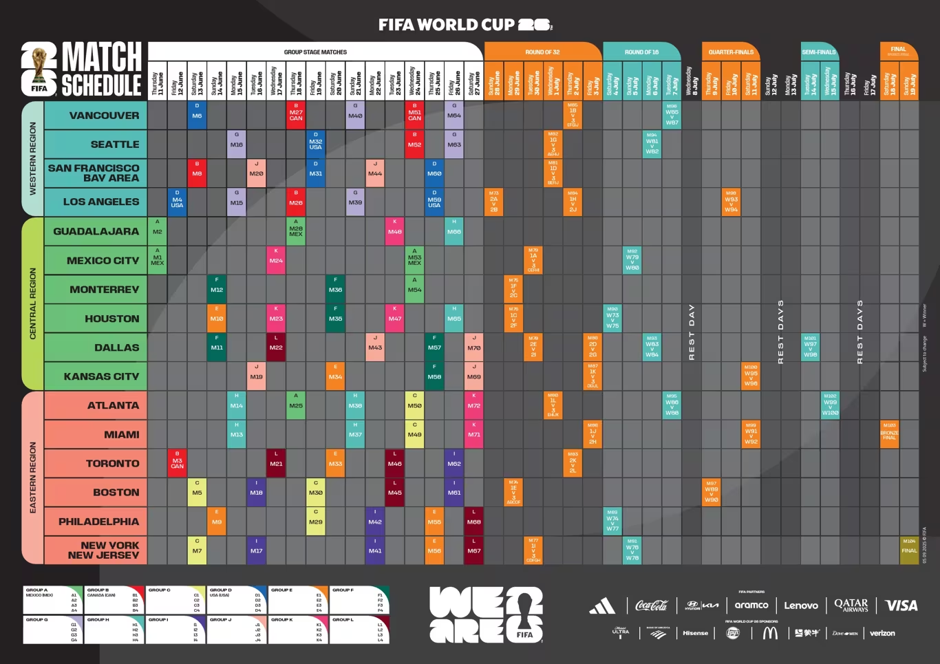 فیفا قرار است برنامه کامل مسابقات (شامل ورزشگاهها و زمان شروع بازیها) را در یک پخش تلویزیونی جداگانه در روز شنبه منتشر کند چون مسئولان فیفا بتوانند بفهمند کدام زمان و کدام ورزشگاهها برای هوادارانی که به آمریکای شمالی سفر میکنند و همچنین تماشاگران تلویزیونی، بهترین کارایی را دارد؛ به عنوان مثال، شروع زودتر برای هواداران در اروپا یا غرب آسیا بهتر است.