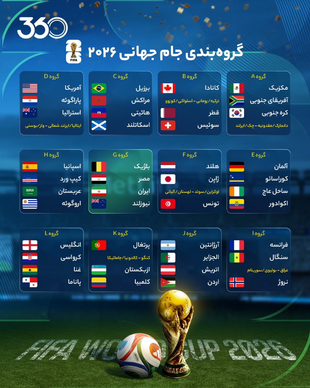 به گزارش فوتبال 360، بالاخره بعد از مدتها انتظار، قرعه ایران در جام جهانی 2026 مشخص شد. تیم ملی که از منطقه آسیا، صعود به نسبت زودهنگامی به جام جهانی داشت، روزهای زیادتری را منتظر ماند تا تکلیف رقبای مرحله گروهیاش مشخص شود. ایران در مراسمی که چهارشنبه شب در واشنگتن برگزار شد، با ایستادن در گروهG با بلژیک، مصر و نیوزلند همگروه شد.
