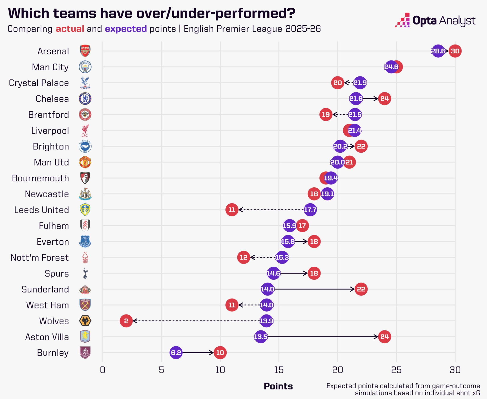 در هر زمینه دیگر، آمار امید گلهای استونویلا باید نگرانکننده میبود و اکنون صرفاً نتایج خارقالعاده تیم باعث شده چنین نگرانی در جمع هواداران وجود نداشته باشد. نکته، صدالبته بهطور مشخص، اونای امری را نگران کرده و این نگرانی از صحبتهای سرمربی هویداست.از فصل 13-2012 تا کنون، تنها 16 تیم در یک فصل کامل لیگ برتر انگلیس، آمار امید گل پایینی همچون استونویلا داشتهاند و در نهایت 12 از این 16 تیم، فصل را با سقوط به پایان رساندهاند. با این حال ستارگان تیم با قابلیتهای خارقالعاده در شلیک موشکهای دوربرد از بحران در رختکن استونویلا جلوگیری به عمل آوردهاند.