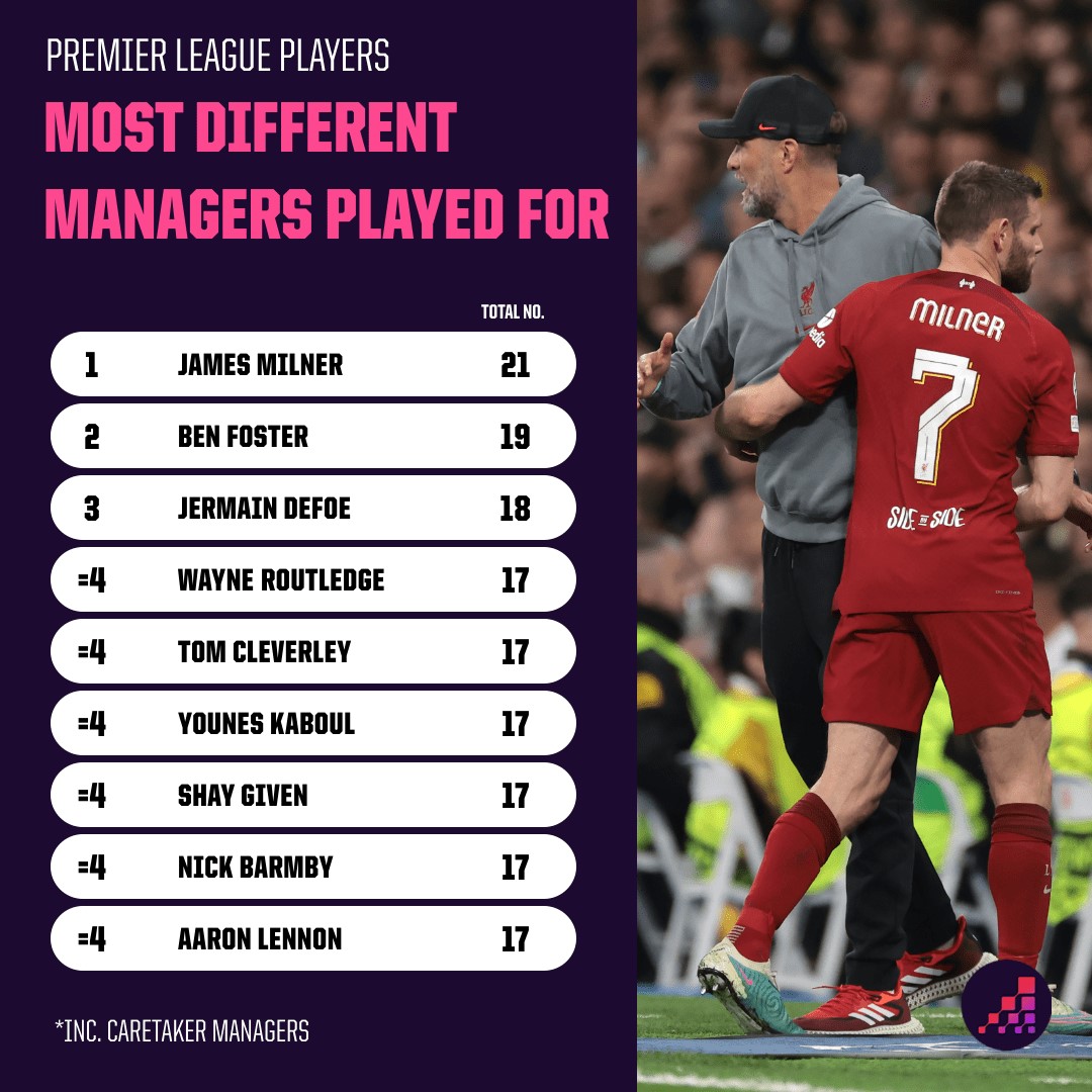 نگاهی سریع به فهرست بازیکنان مسن با بیشترین اختلافهای سنی نسبت به مربیانشان نشان میدهد از میان 10 مورد رکورددار، فقط 2 نفر، غیر دروازهبان هستند. جدا از میلنر، تنها ایوان پریشیچ زیر نظر رایان میسن در این جمع دیده میشود و صدالبته او اختلافی «فقط» 2 سال و 131 روز نسبت به سرمربیاش داشته.